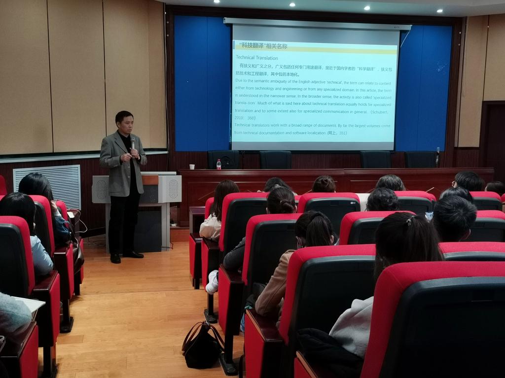 10月21日下午,上海外国语大学博士生导师韩子满教授应我院邀请在外语学院北楼二厅开展学术讲座,主题为“科技翻译正名与科技翻译批评”。本次讲座由外语学院院长杨朝军主持,外语学院广大师生积极参与,共同聆听此次讲座。