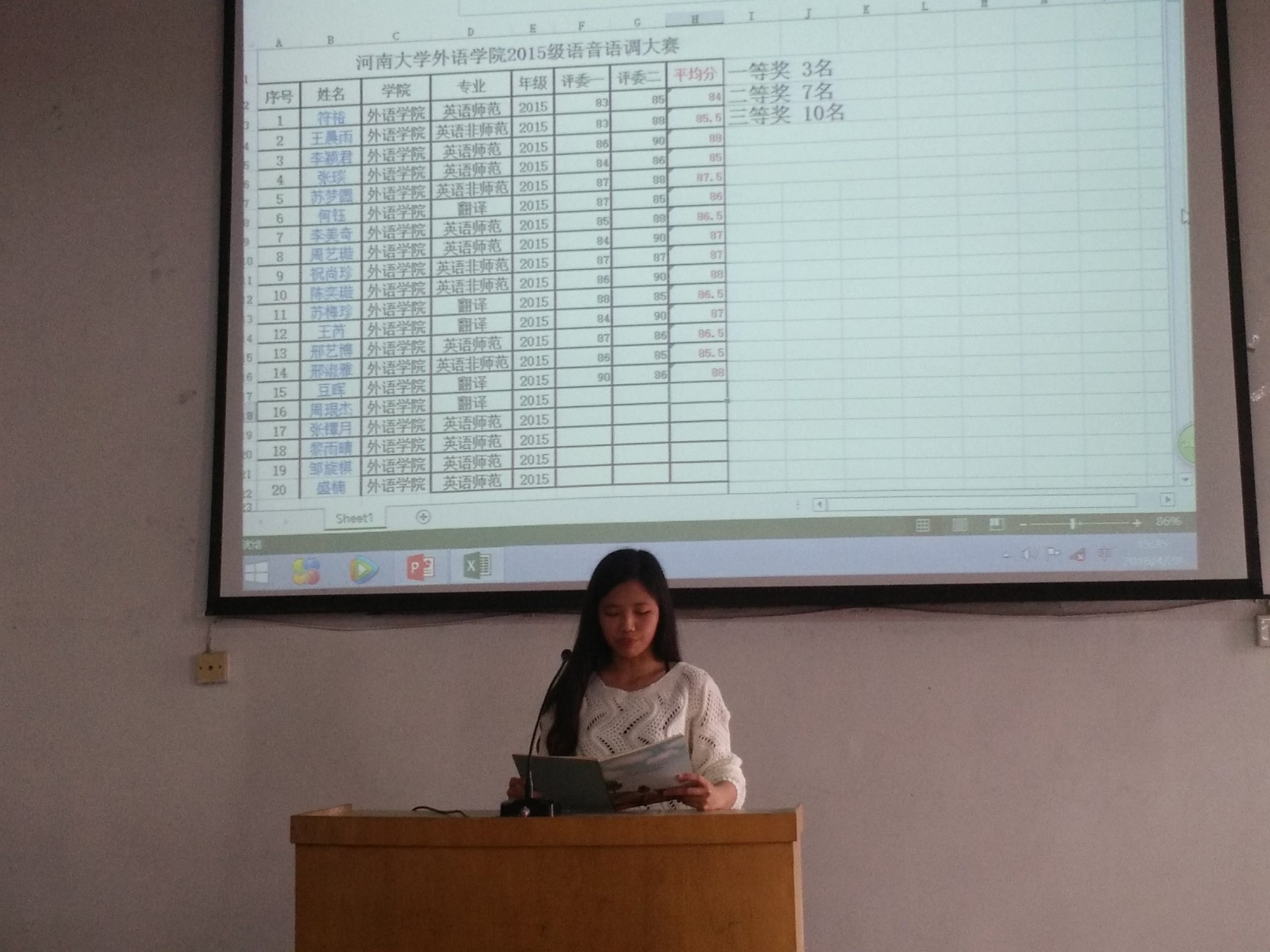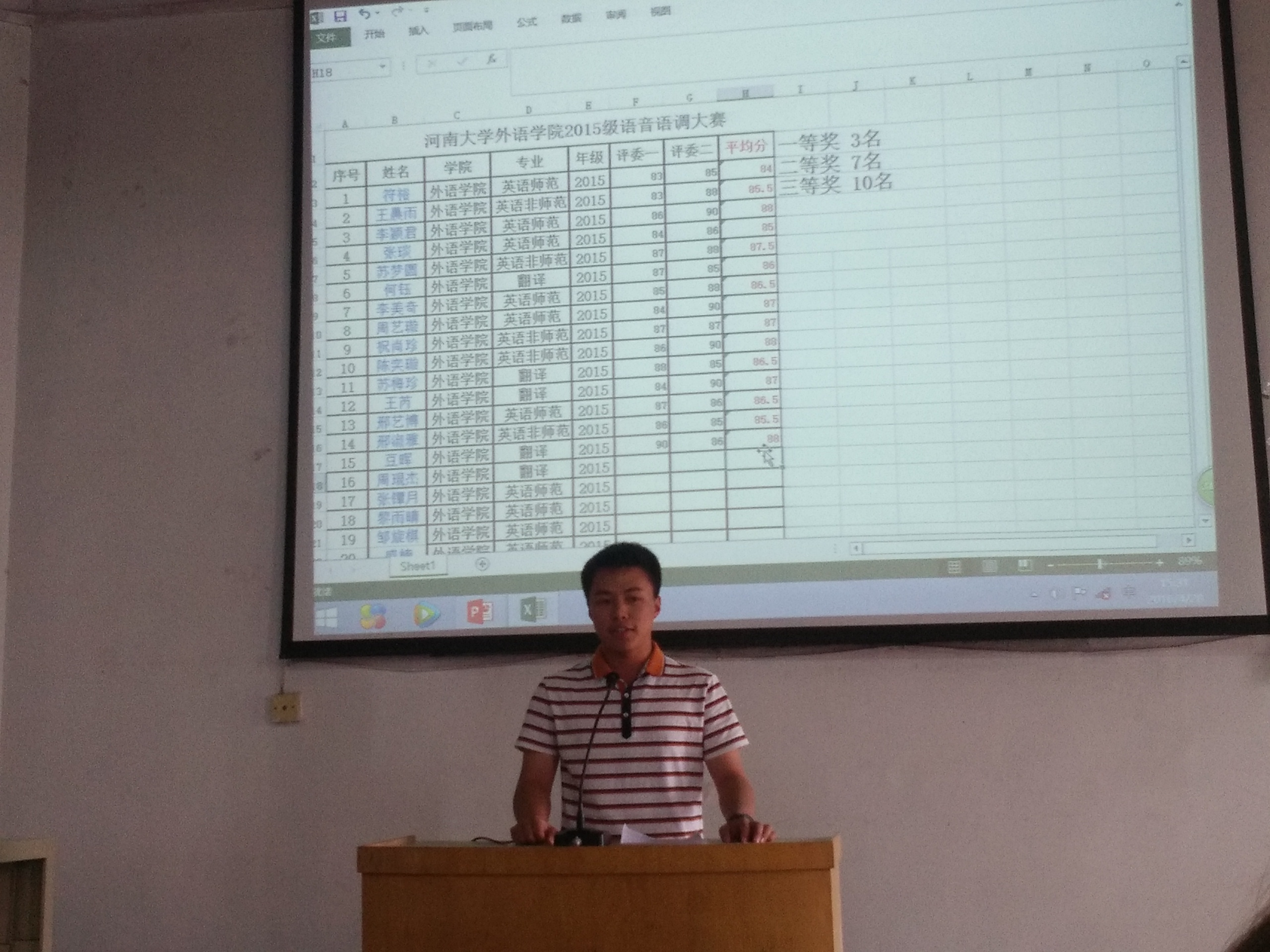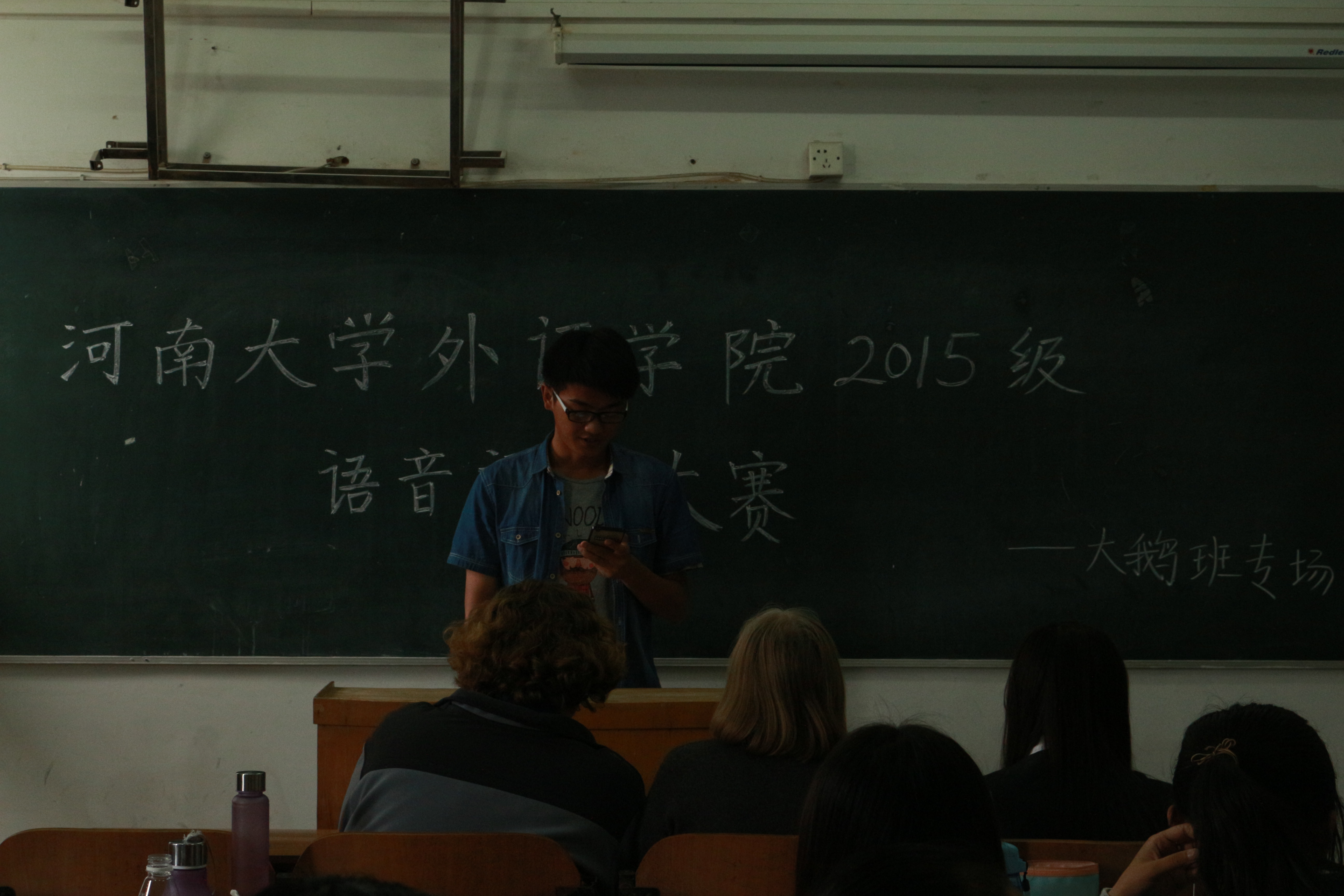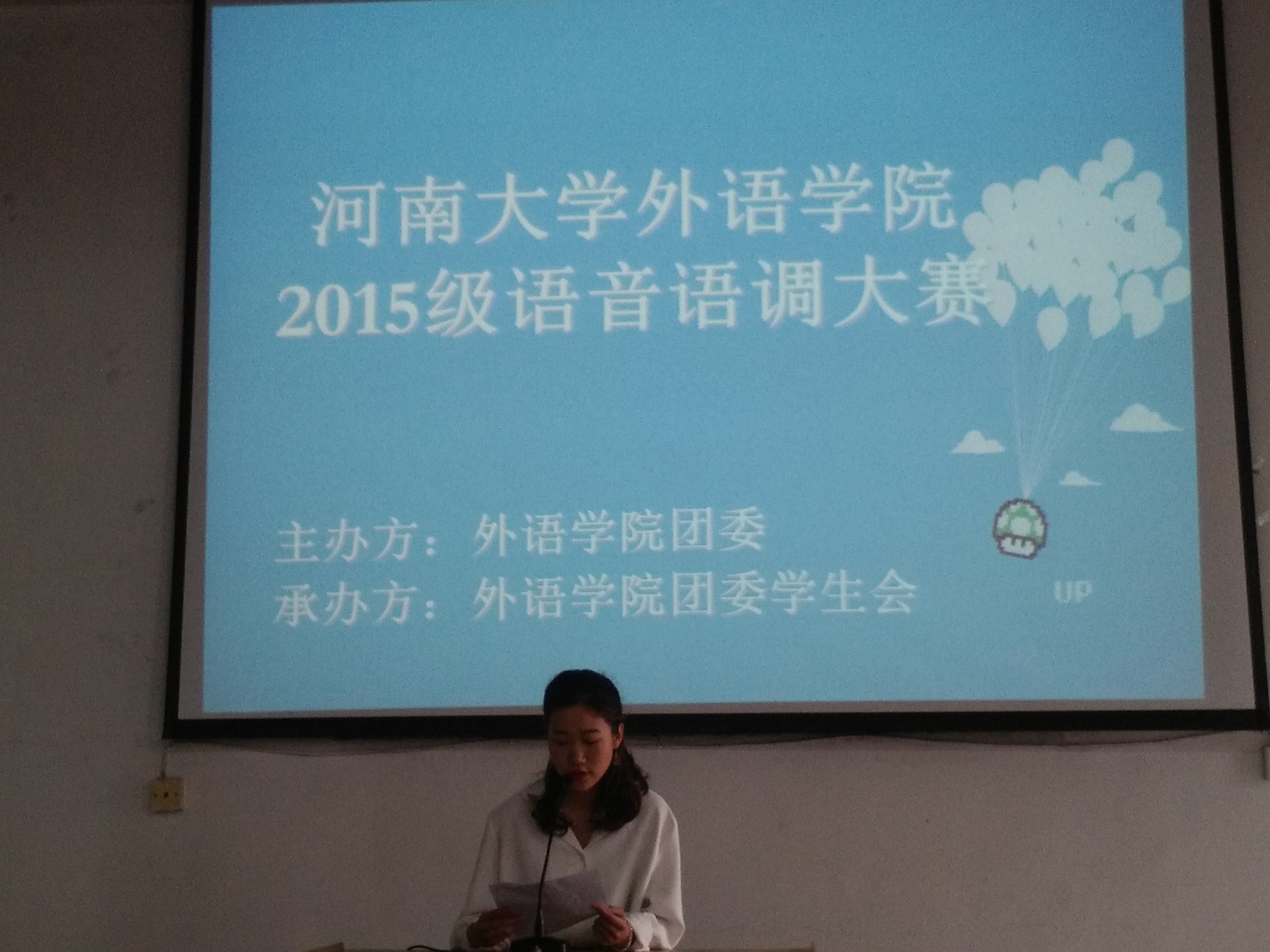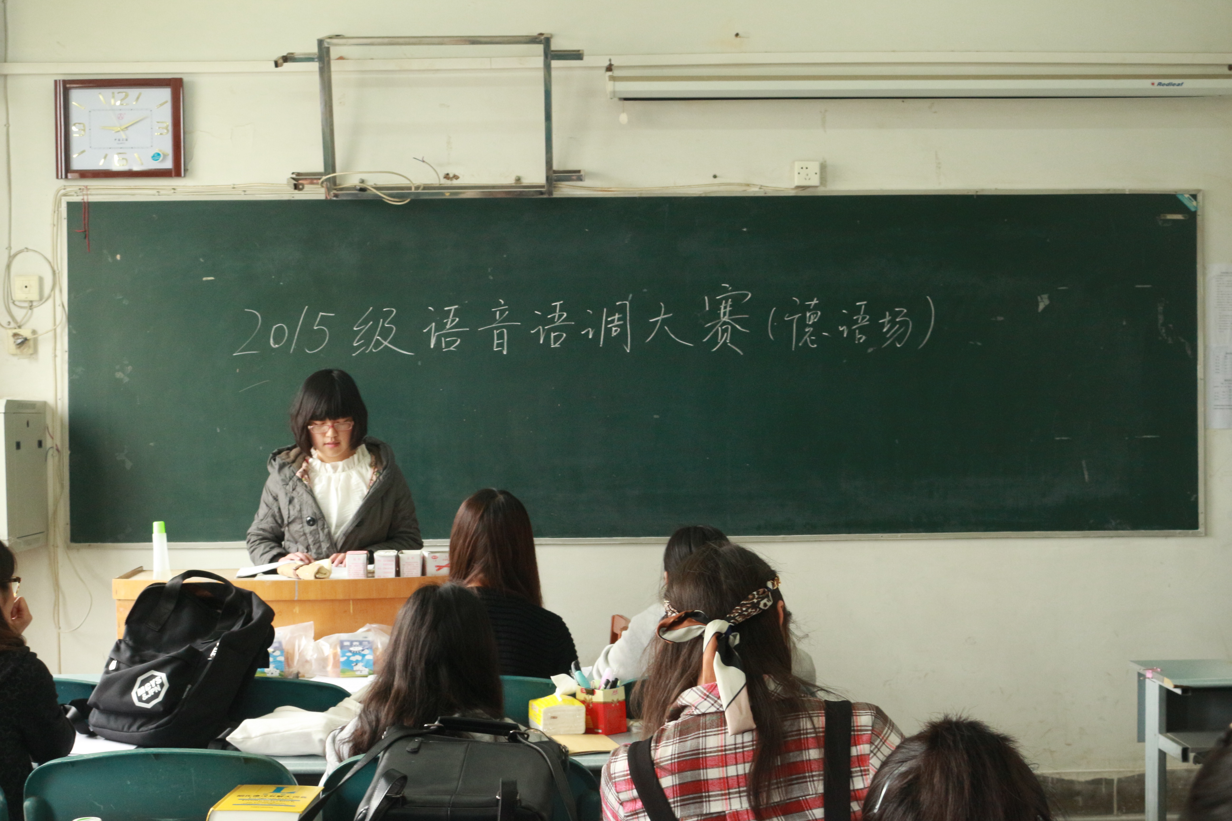 4月28日下午两点三十分,由我院团委举办的2015级新生语音语调大赛拉开帷幕。此次比赛分为英语场和其他语种场,英语场在外语学院北楼五厅举行,其他语种场分别在2015级各班教室举行。比赛邀请各专业课教师,外籍教师以及各专业高年级优秀学生来担任评委,我院15级学生积极参与,共有20名选手参加英语场,80名参加其他语种场比赛。