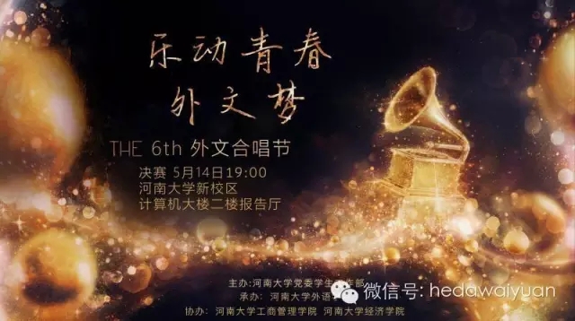 为了创建丰富和谐的校园文化,凝聚青春正能量,5月14日晚,由河南大学党委学生工作部、共青团河南大学委员会主办,外语学院承办,工商管理学院和经济学院协办的“乐动青春外文梦•践行核心价值观”第六届河南大学外文合唱节总决赛在金明校区计算机学院二楼报告厅举行。相关部门和学院领导以及广大师生共同观看了比赛。