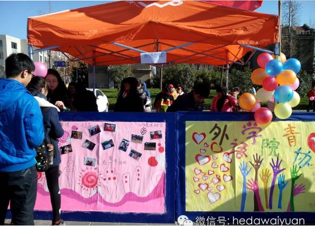 经过前期精心的准备,外语学院青年志愿者协会给大家带来了一系列精彩的活动。《故事接力》充满趣味,故事仅有开头,接下来由前来参与活动的同学将故事补充完整,整个故事讲述了同学们来到河大后身边发生的一些有趣的事情。《别踩黄块》挑战性强,它需要挑战者用筷子夹住乒乓球并保持球不落地,在四秒内通过方框中的白色区域,通过即有小礼品相送。《心有灵犀》新颖别致,考验了参与者们的默契程度,《拯救大问号》更像是现实版的“一站到底”,挑战者从箱子中抽出题后需要给出准确答案,这些有关外国文化的考题更是考验了同学们国外文化的知识储备。这些活动充满趣味,同学们更是踊跃参加,活动现场气氛活跃。此外,我院青协成员为路过的师生系上象征活力与青春的绿丝带,呼吁广大师生继续把爱心传递下去。