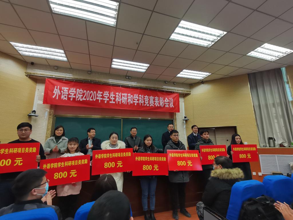 2020年12月31日下午,外语学院2020年度学生科研及学科竞赛表彰大会在学院北楼三厅召开,向一年来在学术论文、学科竞赛和科研项目获得优异成绩的学生进行表彰和奖励。校党委副书记张宝明、党委学生工作部部长王友成、外语学院党委书记安家亮、院长杨朝军、院党委副书记马晓静出席会议并为获奖学生颁奖。会议由外语学院党委书记安家亮主持。