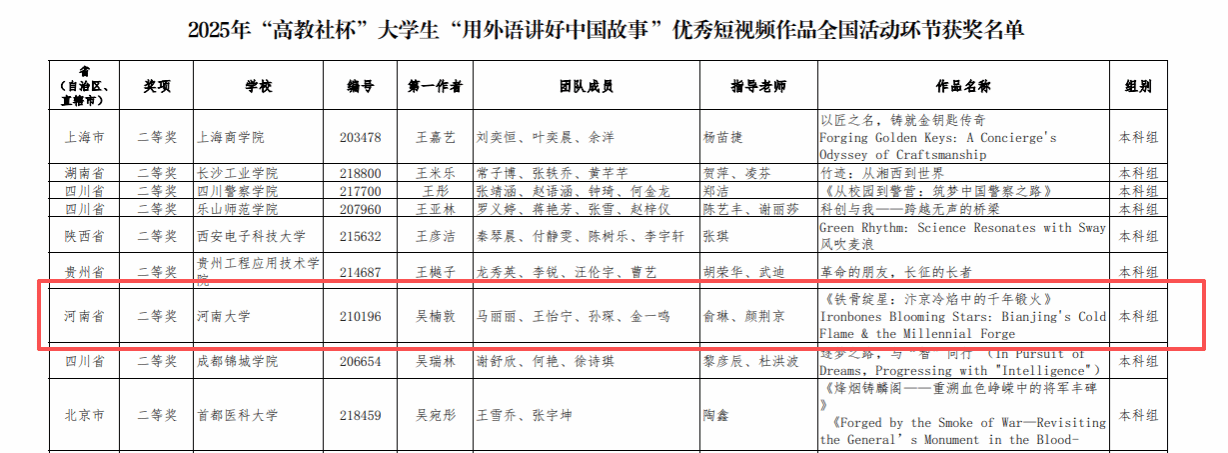 喜报|外语学院(高级翻译学院)学子荣... 外语学院(高级翻译学院)召开秋季学期... 外语学院(高级翻译学院)召开第四期中... 情暖重阳,爱在西湖|外语学院(高级翻... 白云登高志更壮 ——河南大学广东校友会... 河南大学通识课《意大利文化》跨学科团... 外语学院(高级翻译学院)2025级新生集... 河南大学外语学院(高级翻译学院)举办 ... 外语学院(高级翻译学院)召开党委(扩... 外语学院(高级翻译学院)召开第三期中...喜报|外语学院(高级翻译学院)学子荣获2025年“高教社杯” 大学生“用外语讲好中国故事”短视频全国二等奖