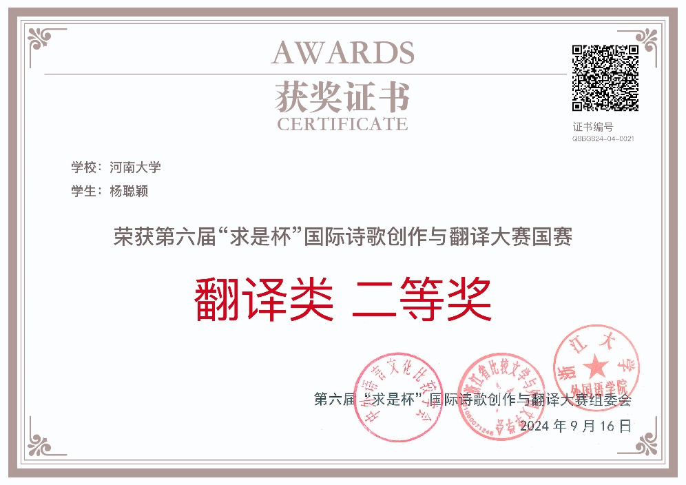 外语学院(高级翻译学院)全体师生观礼阅兵 外语学院(高级翻译学院)在2024-2025学... 外语学院(高级翻译学院)举行唐河县202... 河南大学外语学院(高级翻译学院)成功... 喜报!外语学院(高级翻译学院)梅冰教... Pura Vida:来自中美洲的问候与启示 --... 喜报!外语学院(高级翻译学院)教师在... 外国语言文学博士后流动站张翠英博士入... 河南大学外语学院党委与河南大学团委党... 外语学院(高级翻译学院)领导看望慰问...高级翻译学院俄语系学生 荣获“求是杯”国际诗歌创作与翻译大赛二等奖
